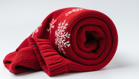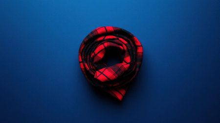 A close-up image of a neatly rolled red and black checkered scarf set against a dark blue background, perfect for showcasing winter fashion accessories.