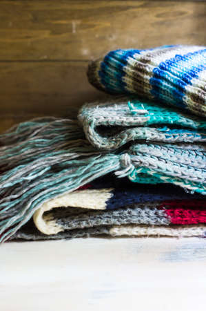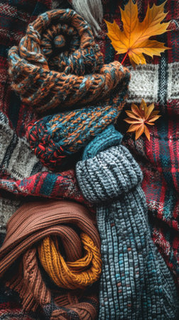 A close-up shot of several knit scarves and hats arranged on a plaid blanket. The scarves and hats are made of different colored yarns and are arranged in a loose, casual manner. Some autumn leaves are scattered on the blanket, adding to the cozy and autumnal feel of the image.