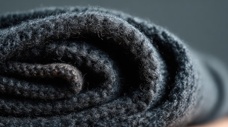 This close-up image showcases a rolled dark gray knitted fabric, emphasizing its soft texture and cozy appeal, perfect for textile and fashion applications.