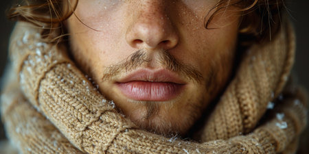 Young caucasian female in cozy knitted scarf with focus on hands and lips.