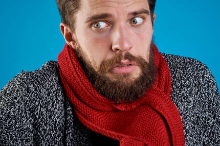 Man with a beard on a blue background, illness, cold, sick, portrait.