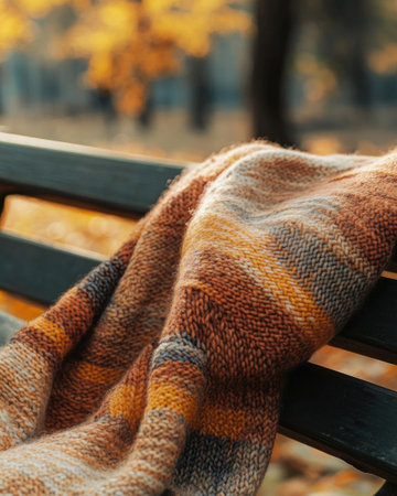 Knitted autumn blanket, rich earthy tones, draped on a bench