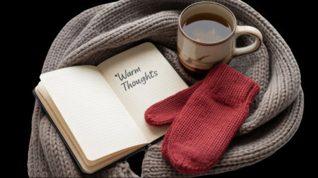 Warm thoughts notebook, teacup, mittens, and scarf on transparent background