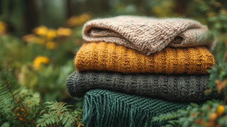 A picturesque autumn arrangement featuring a wool scarf and a warm jacket atop a rustic table, complemented by steaming cups and vibrant leaves.