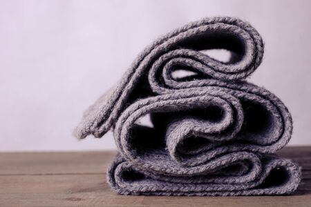 Comfort warm scarf for cold weather. Knitted grey cap on white wooden backgraund with copy space. Flat lay