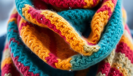 A close-up view of a warm and colorful knitted scarf, showcasing intricate textures and vibrant patterns, ideal for adding style and warmth to any outfit.