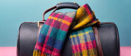 A sleek dark travel bag with a sturdy handle leans against a soft pastel backdrop, topped with a vibrant knitted plaid scarf, ideal for any trip.