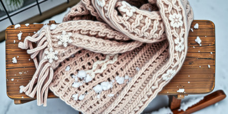 This image features a beautifully knitted scarf resting on a wooden table, surrounded by delicate snowflakes, evoking warmth and comfort.