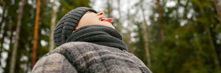 Header of Caucasian child tilting head back catching snowflakes on tongue outdoors in winter forest wearing knit hat and scarf, enjoying snowfall with mouth open, trees in background