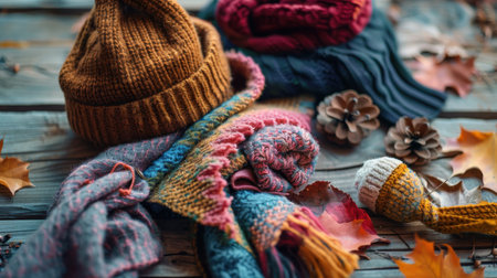A brown knit hat, a multi-colored scarf, and a pair of knit gloves are arranged on a weathered wooden surface. Autumn leaves are scattered around the items.