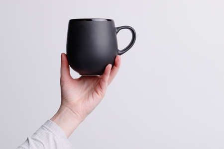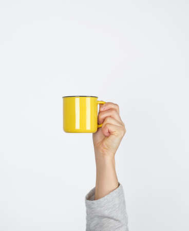 yellow ceramic cup in a female hand on a white background, hand is raised up