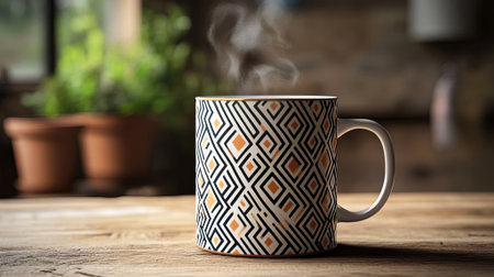 Geometric patterned ceramic mug filled with hot drink, resting on wooden table, with plants in background, evoking a warm and inviting ambiance, AI generated