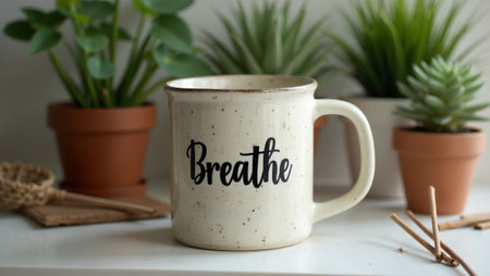 Cozy ceramic mug with Breathe surrounded by plants incense