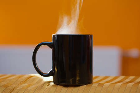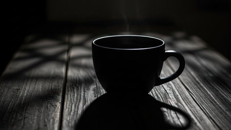 A black coffee cup stands on a wooden table, creating a strong silhouette against a dark background. Subtle steam rises, suggesting warmth. The composition uses dramatic lighting and shadow. This image could be used for various projects, including advertising or editorial content about beverages.