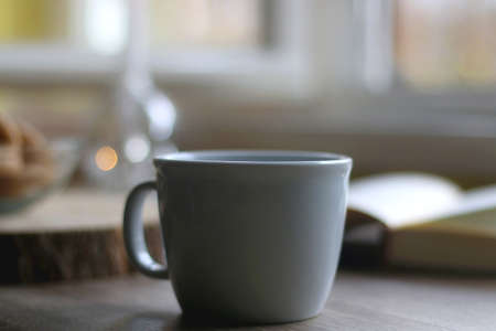 blue cup on a wooden table, against the window with a sunny summer day / reinforcement force warm mood