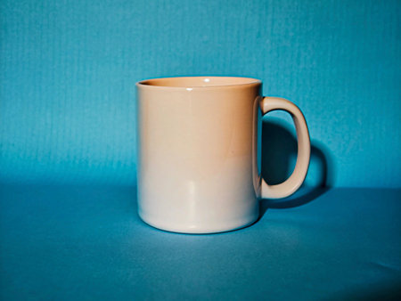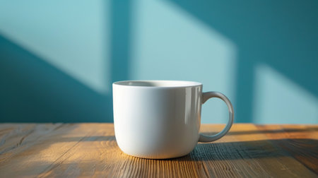 A minimalist white ceramic coffee mug placed on a wooden table with a blue background, creating a simple and serene setting ideal for coffee or lifestyle themes.