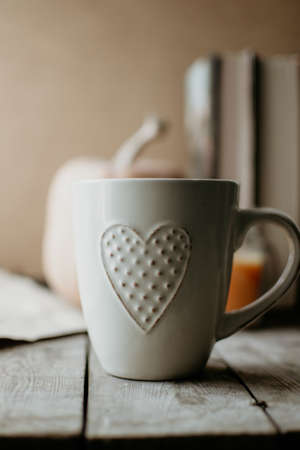 Pumpkin, tea and autumn leaves on the background. Autumn still life with pumpkin, candle and cup of tea on the wooden table. Thanksgiving, autumn season. Copy space