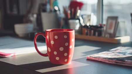A vibrant red polka dot coffee mug sits on a wooden desk, illuminated by natural light. Perfect for adding warmth and charm to any workspace or home setting.
