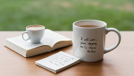 This image was generated using AI. Coffee cups rest on a wooden table next to handwritten notes that evoke affection, care, and emotional connection. The warm and intimate composition conveys a gesture of everyday kindness, ideal for campaigns about emotional health, human connection, and shared moments. Perfect for editorial, social, and commercial content that promotes empathy and well-being.