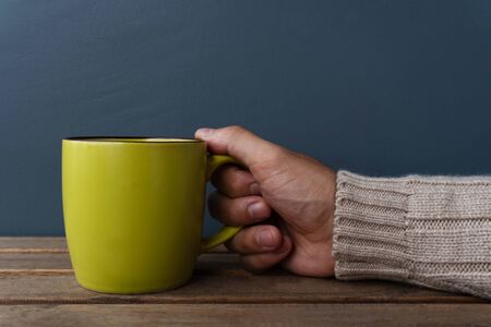 Mans hand holds green mug at the background of dark blue wall on wooden rustic table.