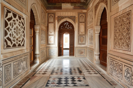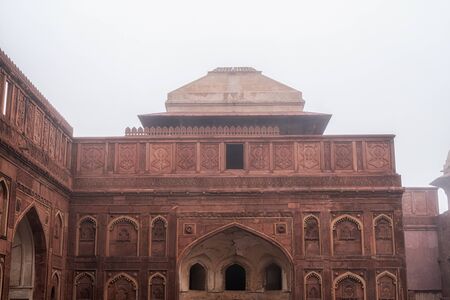 agra fort interior architecture view, a historical fort, in the city of Agra in India taken during winter fog.