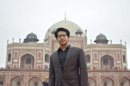 A young adult Indian man standing in front of The Humayun Tomb.New Delhi. This image was taken on June 2018.