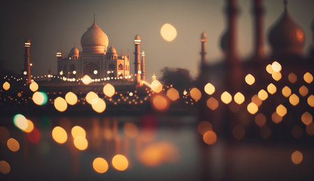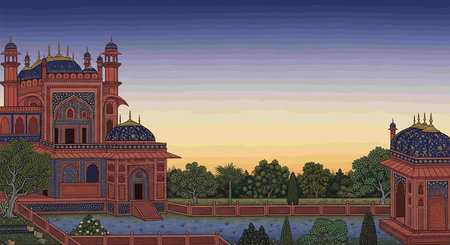 Illustration of a beautiful landscape of the Taj Mahal at sunset