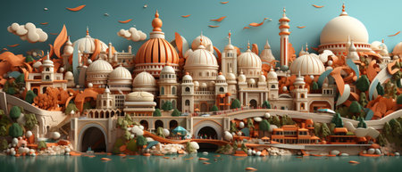 A vibrant 3D illustration representing Republic Day festivities. This colorful scene showcases intricate architecture and imaginative design elements celebrating cultural heritage and unity.
