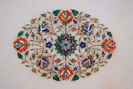 Details of polished marble surface is covered by stone inlay Agra, India