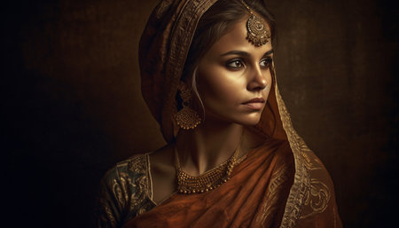 Beautiful young woman exudes elegance and sensuality in traditional sari generated by artificial intelligence