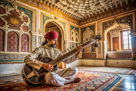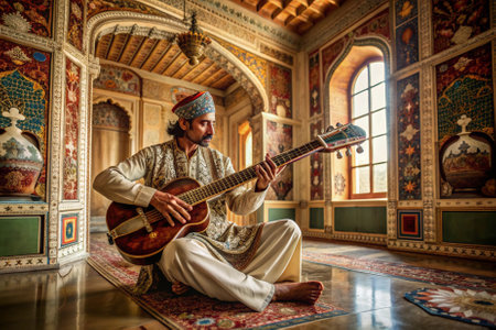 A man in a white robe sits on a rug playing a guitar. The room is decorated with colorful tiles and has a warm, inviting atmosphere