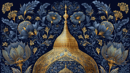 This stunning artwork showcases an elaborate golden dome enveloped by intricate floral patterns in vibrant blue and gold tones, exuding elegance and creativity.