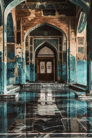 Stunning interior of an ancient Islamic architecture with arched doorways, intricate tilework, and reflective marble floors in rich blue tones