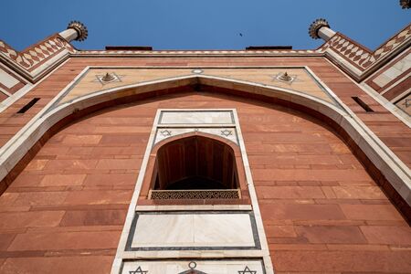 Architectural details of Humayan's Tomb in New Delhi India against bright blue sky