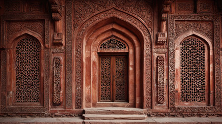 This image showcases a beautifully carved red sandstone entrance featuring intricate patterns and designs. The ornate details reflect rich cultural heritage and architectural mastery.