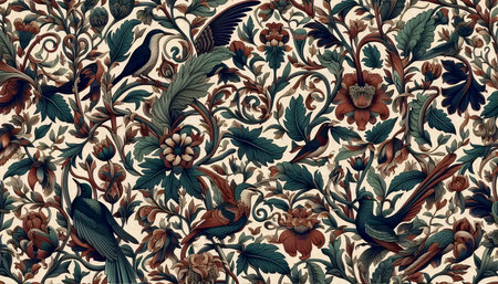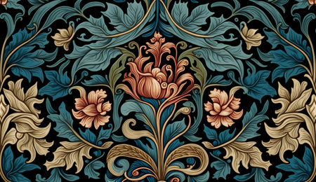 Generative AI, Floral colorful pattern. William Morris inspired natural plants and flowers background, vintage illustration. Foliage ornament.