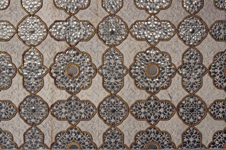details of walls with silver and mirrors in rich decorated Amber fort. Jaipur. India
