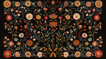 This stunning floral embroidery design showcases colorful blossoms on a dark background, perfect for textiles, art projects, and home decor.