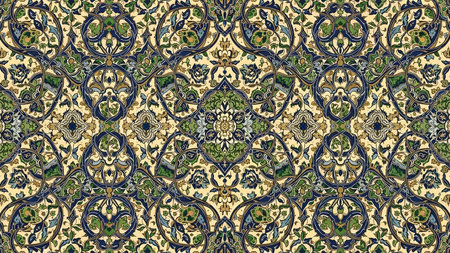Motifs showing vibrant persian floral pattern with deep blue background and ornate yellow green and orange flower motifs. resolution