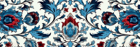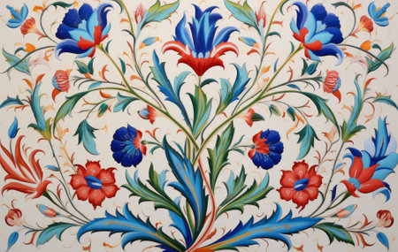 Intricate floral pattern with symmetrical blue and red decorative motifs. That the image is generated using AI.