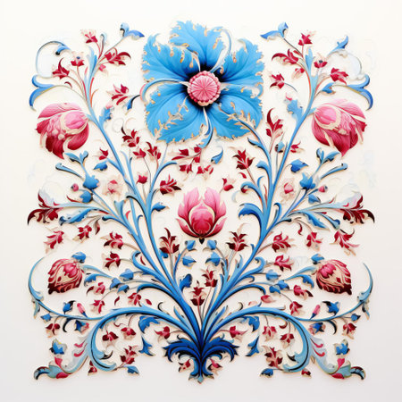 Intricate floral design with vivid blue and red flowers surrounded by detailed leaves on a light background, perfect for artistic and decorative applications