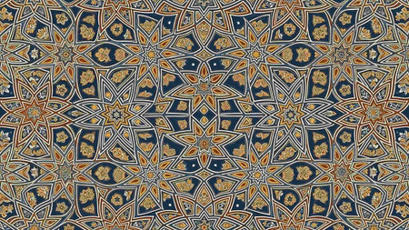 Stock showing complex symmetrical islamic geometric pattern with blue red orange and gold tones on a textured surface. resolution