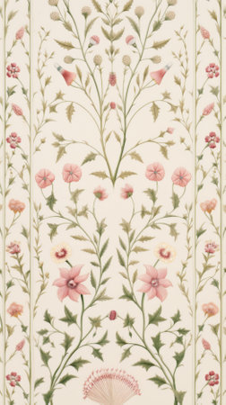 A design displays a variety of flowers and leaves arranged in a symmetrical pattern. The artwork highlights different plant types on a light background.