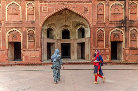 AGRA, INDIA - AUGUST 14, 2017: Women walking inside Agra Fort, Islamic architecture.