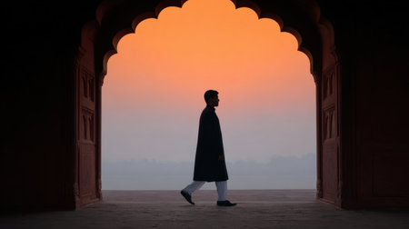 A serene silhouette of a man walking through an intricately designed archway during a stunning sunset, capturing the essence of tranquility and exploration.