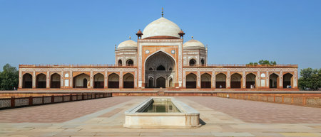 The iconic Humayuns Tomb in Delhi stands majestically under a clear blue sky. Visitors admire the impressive Mughal architecture and serene surroundings in the afternoon sunlight.