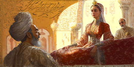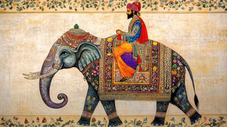 Mughal emperor riding an adorned elephant in a vibrant Indian miniature painting style, showcasing intricate historical artwork