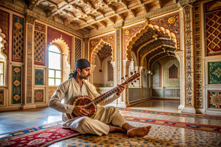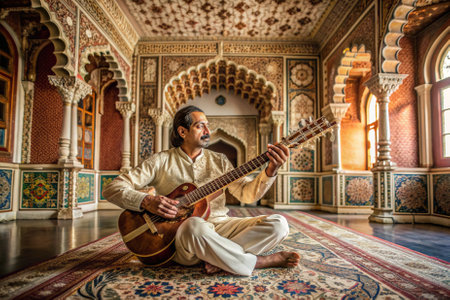 A man in a white robe sits on a rug playing a guitar. The room is decorated with colorful tiles and has a warm, inviting atmosphere