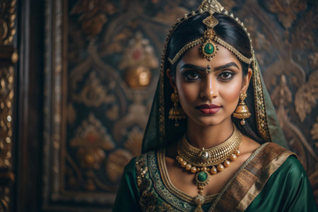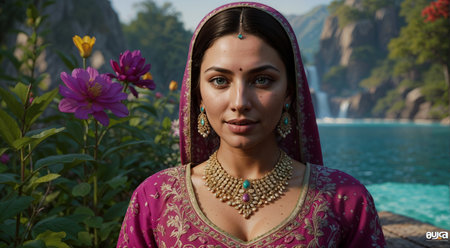 Beautiful young woman exudes elegance and sensuality in traditional sari generated by artificial intelligence