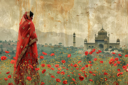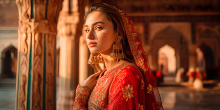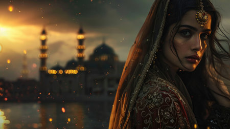 Ethereal Beauty of Indian Woman in Traditional Attire Overlooking Sunset by the Mosque